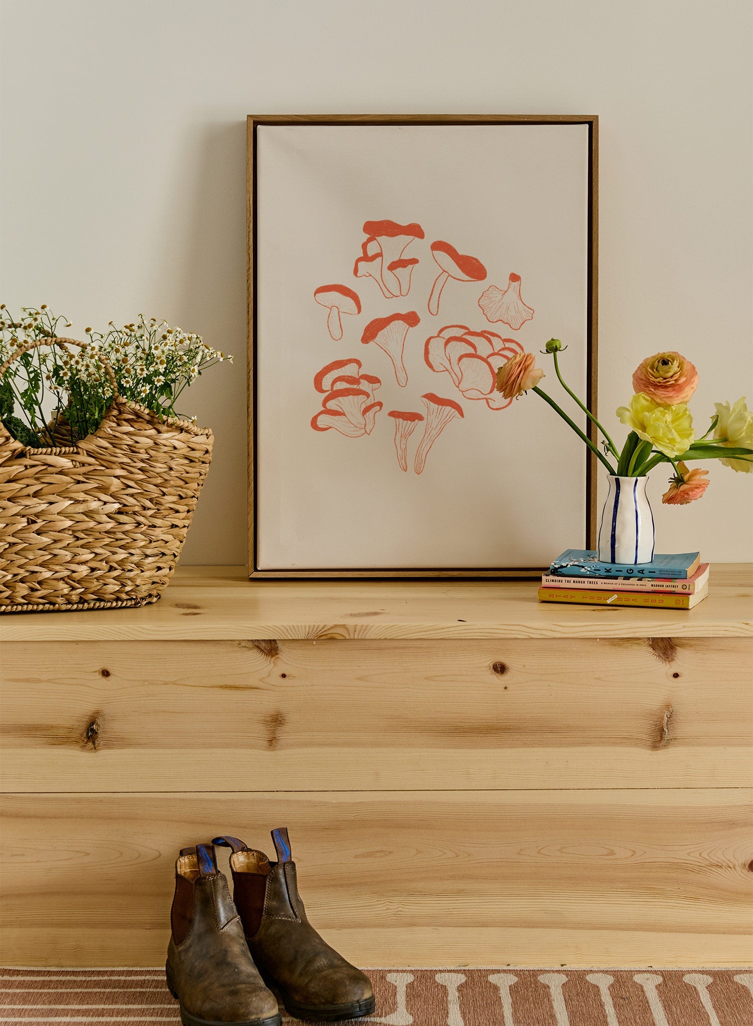 A collection of delicate chanterelle mushrooms is beautifully illustrated in this minimal yet striking print. The fine linework and warm orange tones capture the organic shapes and rich textures of these prized forest treasures. The soft neutral background enhances the composition, giving it an elegant, timeless appeal.
