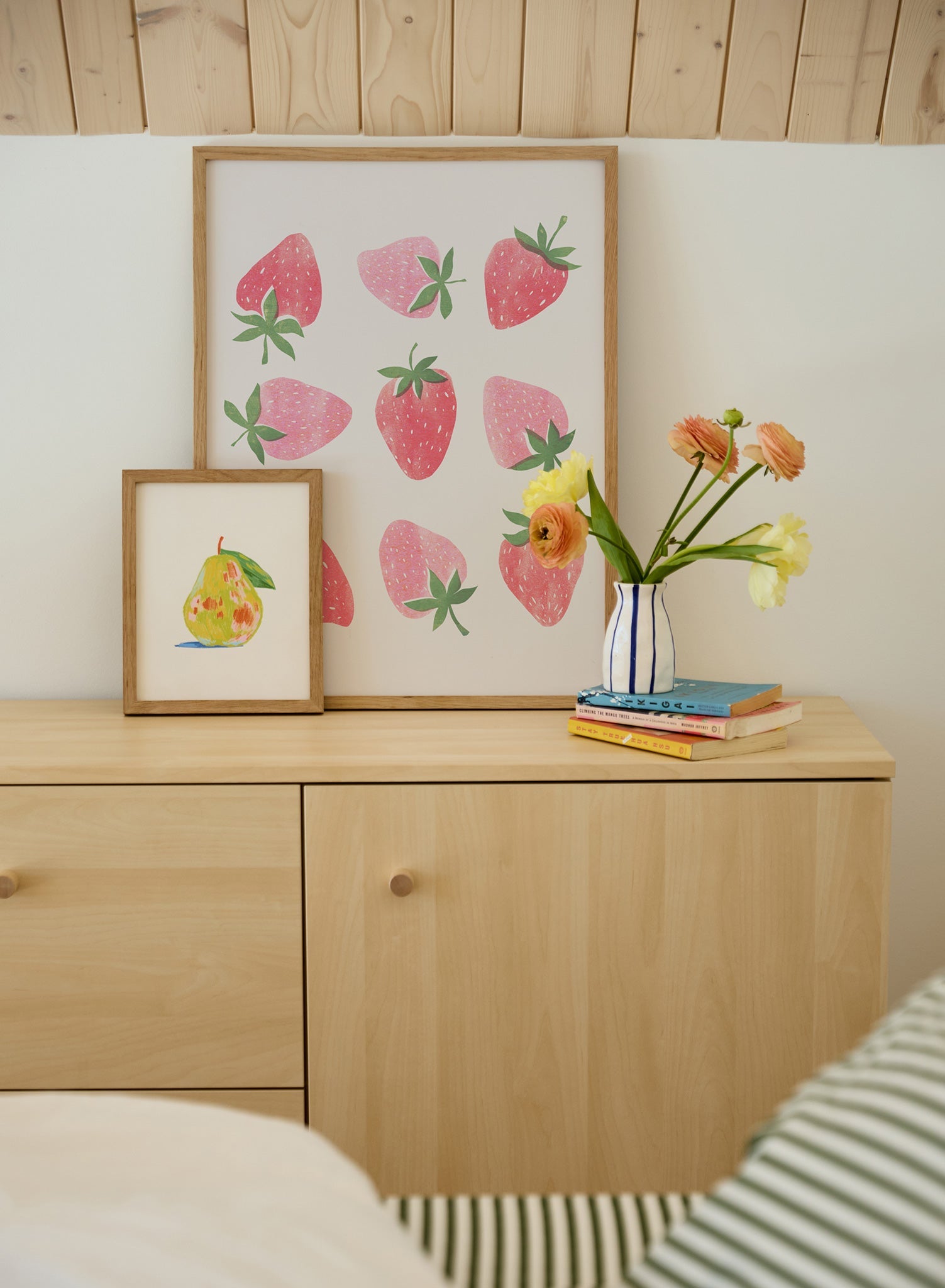 Nine plump strawberries are scattered across this print, each with its own unique shape and tilt, as if freshly tumbled from a basket. Soft pinks and reds blend with delicate white speckles, while the leafy greens add a crisp contrast against the warm, neutral background. The hand-drawn texture gives each berry a natural, painterly quality, capturing the simple pleasure of sun-ripened fruit.